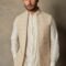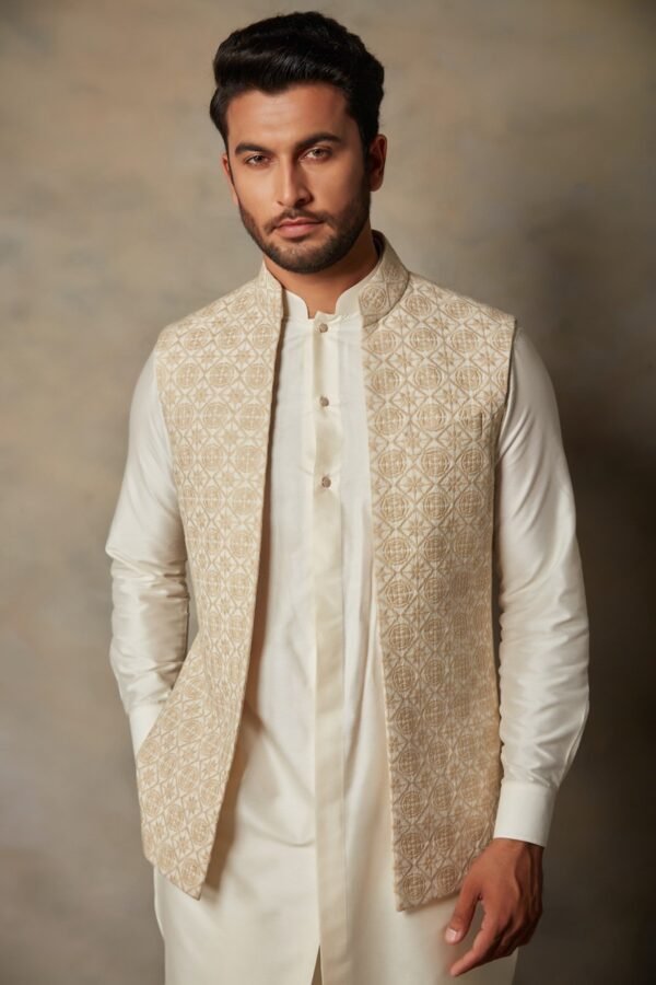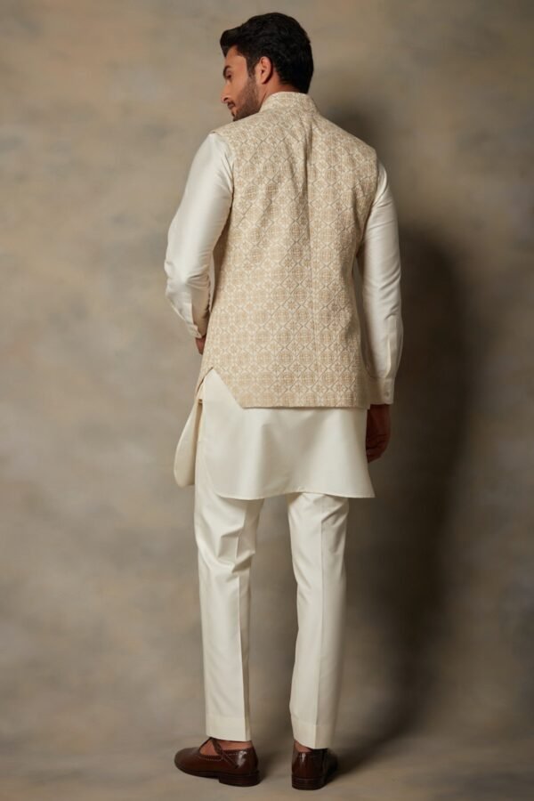 Featuring a beige and cream bundi jacket in rayon base with machine embroidery. It is paired with a matching cotton silk kurta and pants.