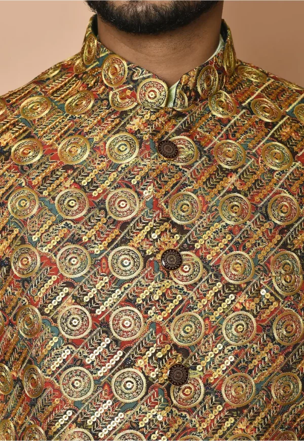 - This Sleeveless and Chinese Collar attire is Enhanced with Buttons, Resham and Sequins Work