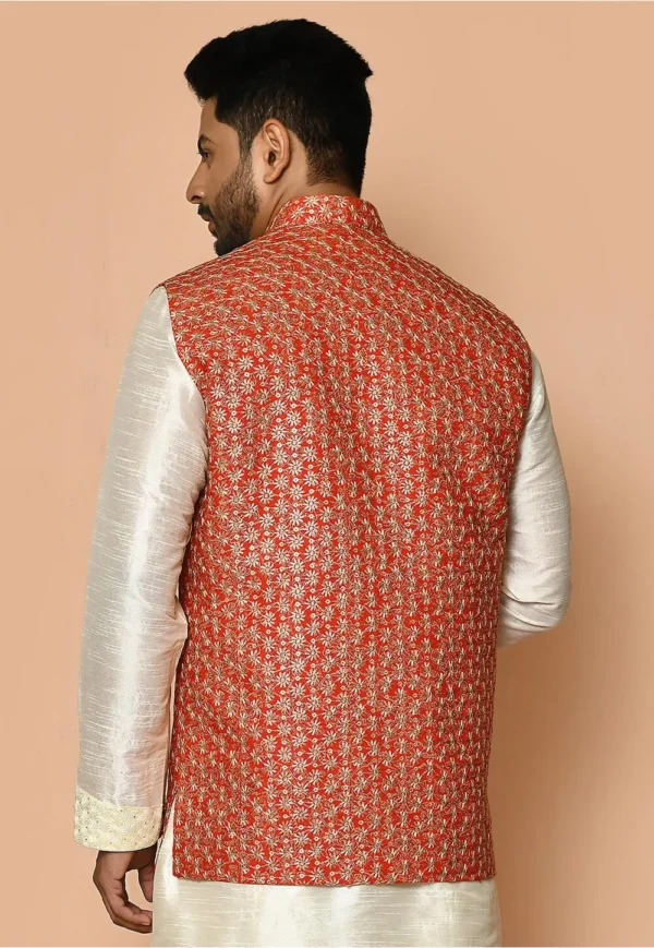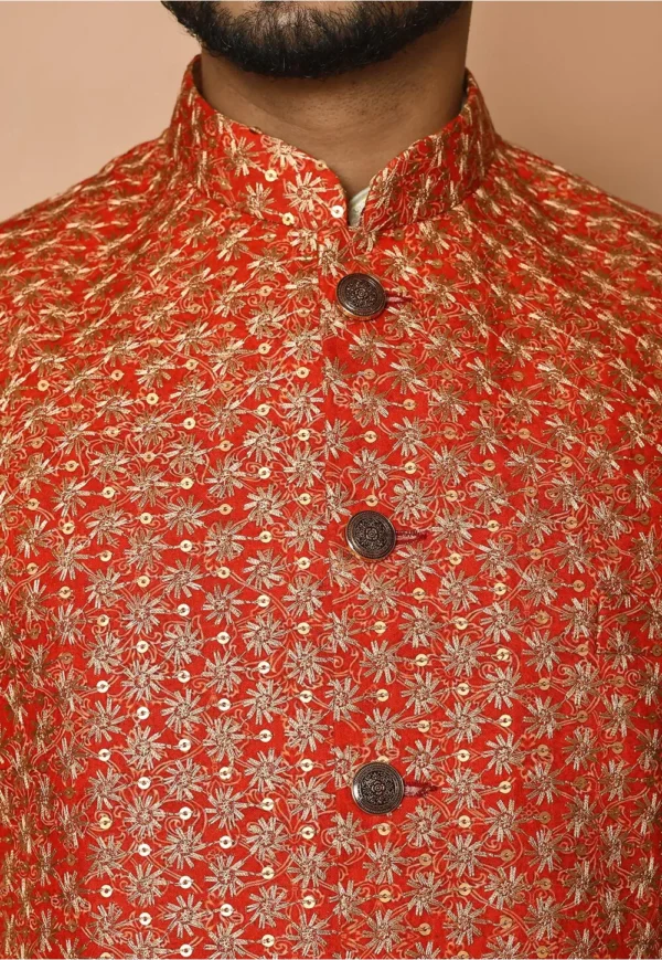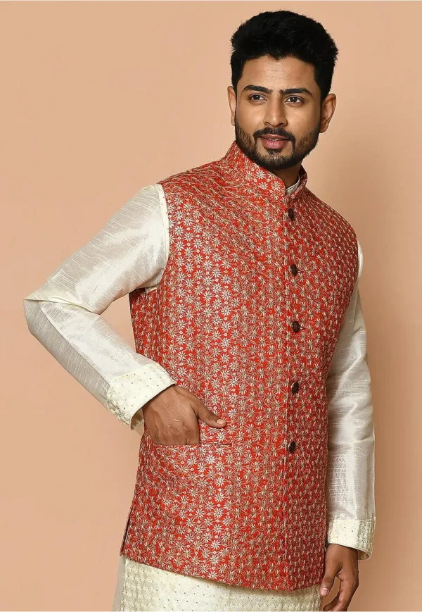 Embroidered Cotton Nehru Jacket in Red