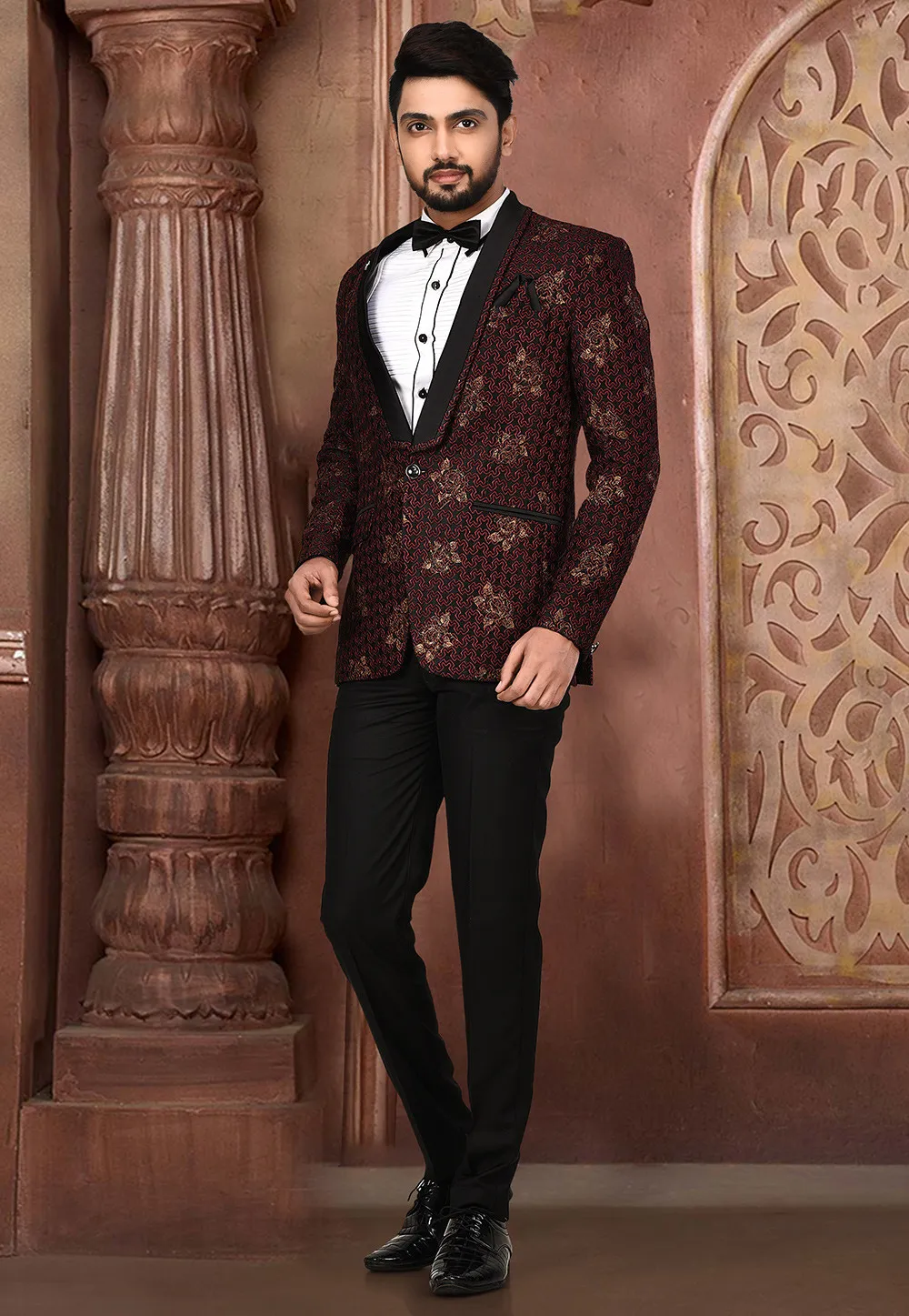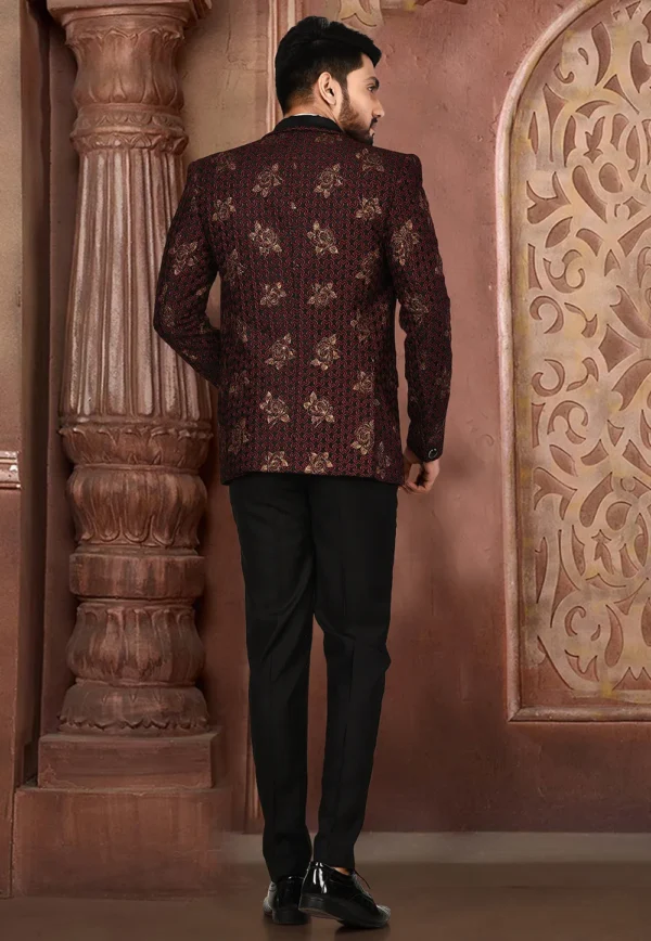 Golden Printed Polyester Lycra Tuxedo in Black and Maroon