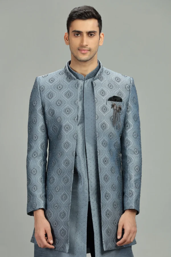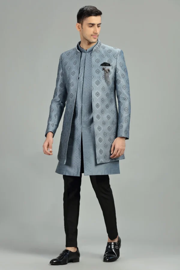 Light Blue Brocade Jacquard Silk Indo Western Sherwani
