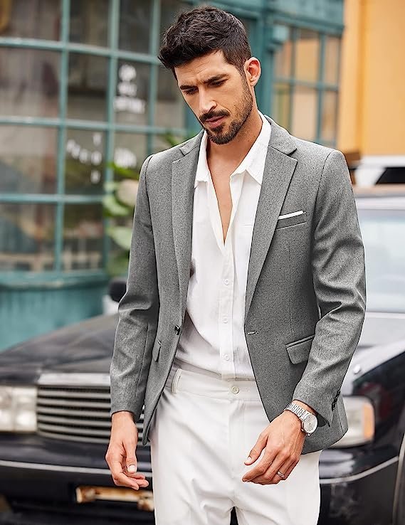 - SUIT BLAZER DESIGN — Modern fashion Lightweight Suit Jacket Blazer with notch lapel, one button closure, left chest real pocket, two front flap real pockets, Inside a real pocket.