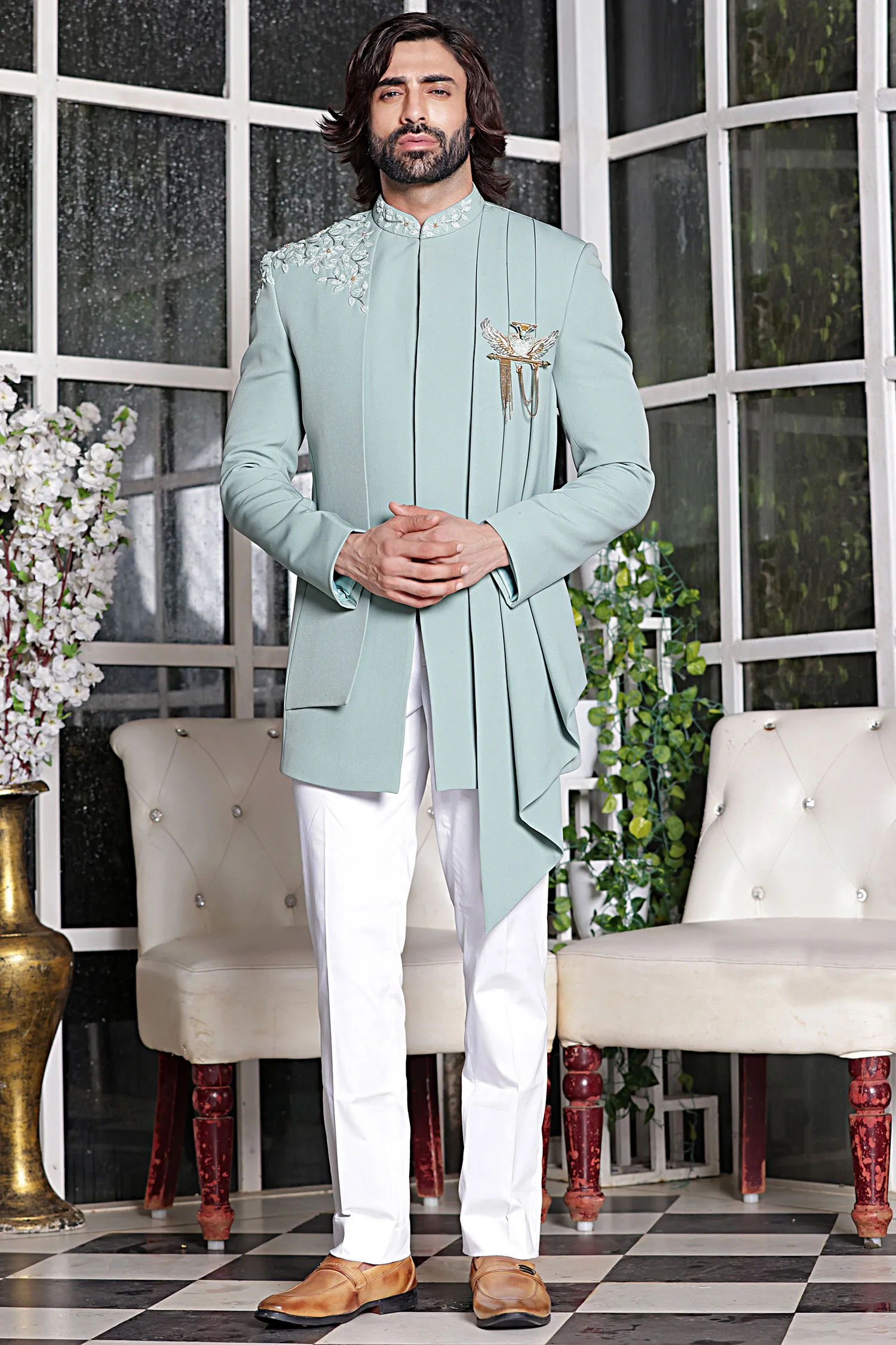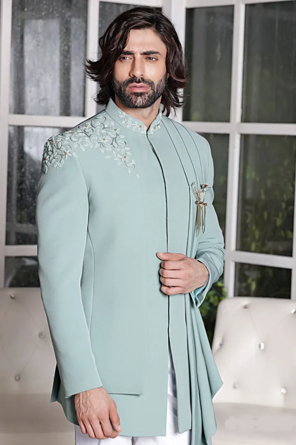 Light Blue Brocade Jacquard Silk Indo Western Sherwani