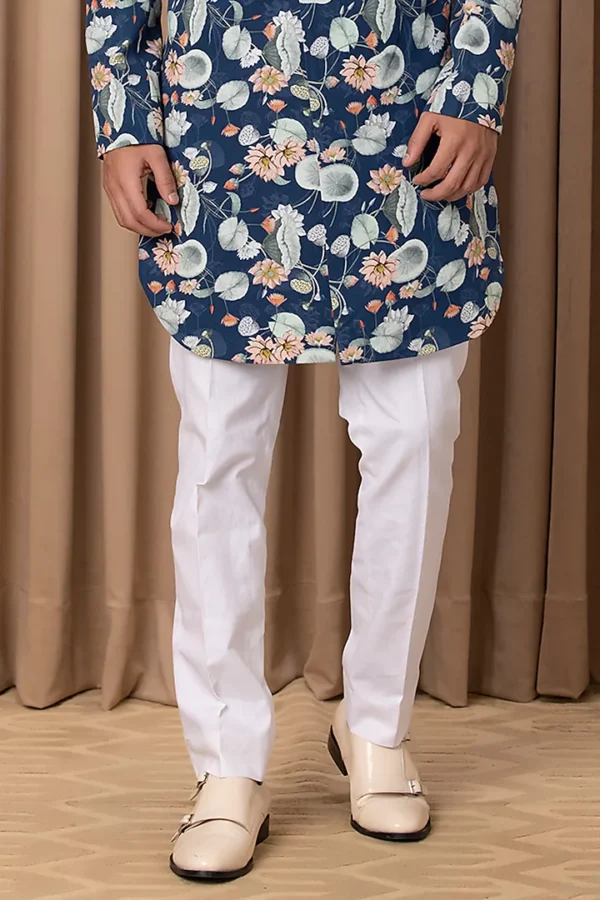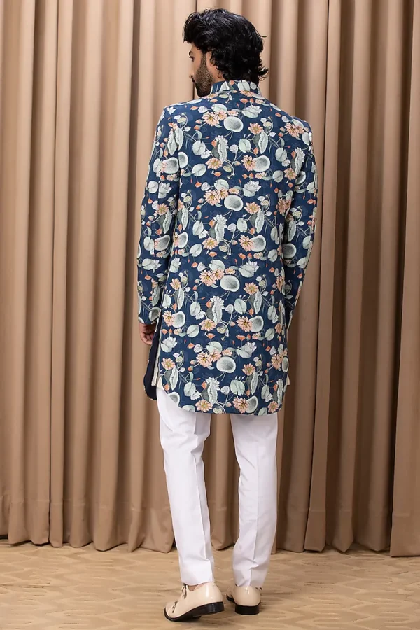Featuring a navy indowestern jacket in cotton and silk base with digital print and hand painting. It is paired with a contrasting white shirt and linen trousers.
